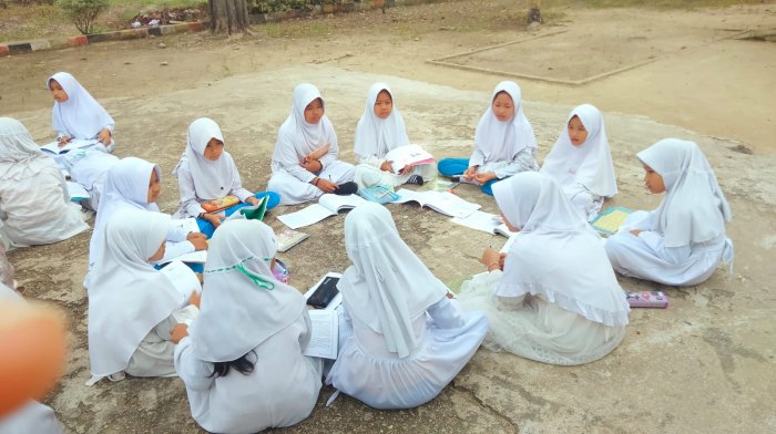 Dalam kegiatan yang diadakan pada hari ini, siswa dibagi menjadi beberapa kelompok kecil yang dipimpin oleh salah satu anggota. Setiap kelompok menghafalkan surat al-qoriah secara bergantian. Mereka kemudian bekerja sama untuk memahami makna serta menghafalkan materi dengan cara saling mengingatkan dan berlatih bersama di bawah pepohonan halaman madrasah.