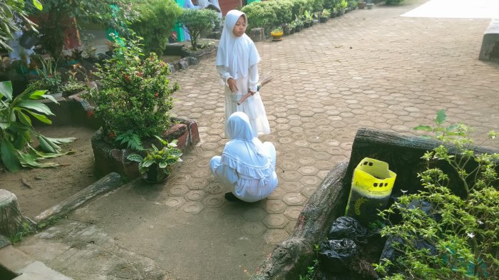 Setiap hari, petugas piket yang terdiri dari beberapa siswa mendapatkan tugas khusus untuk membersihkan lingkungan kelas dan sekitarnya. Tugas tersebut meliputi menyapu dan mengepel lantai kelas, membersihkan jendela dan papan tulis, menata meja dan kursi, serta membuang sampah pada tempatnya. Selain itu, petugas piket juga bertanggung jawab untuk membersihkan halaman sekolah di sekitar kelas mereka.