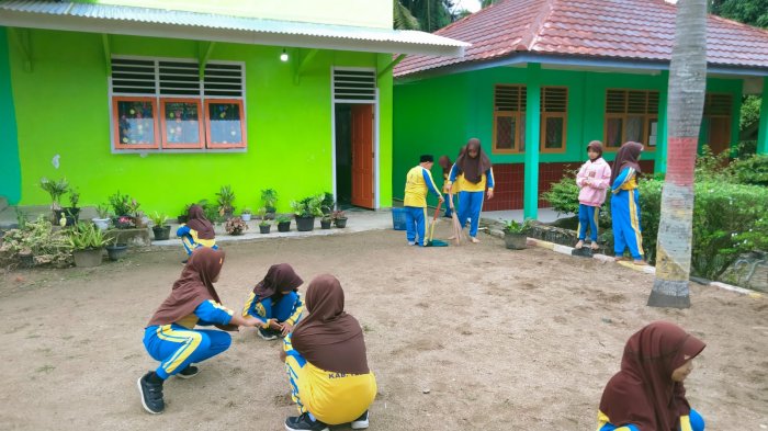 Ada kelompok yang membersihkan kelas, menyapu lantai, membersihkan jendela, dan menata meja kursi. Ada juga kelompok yang membersihkan halaman sekolah, mencabuti rumput liar, menyapu sampah, dan membersihkan selokan.